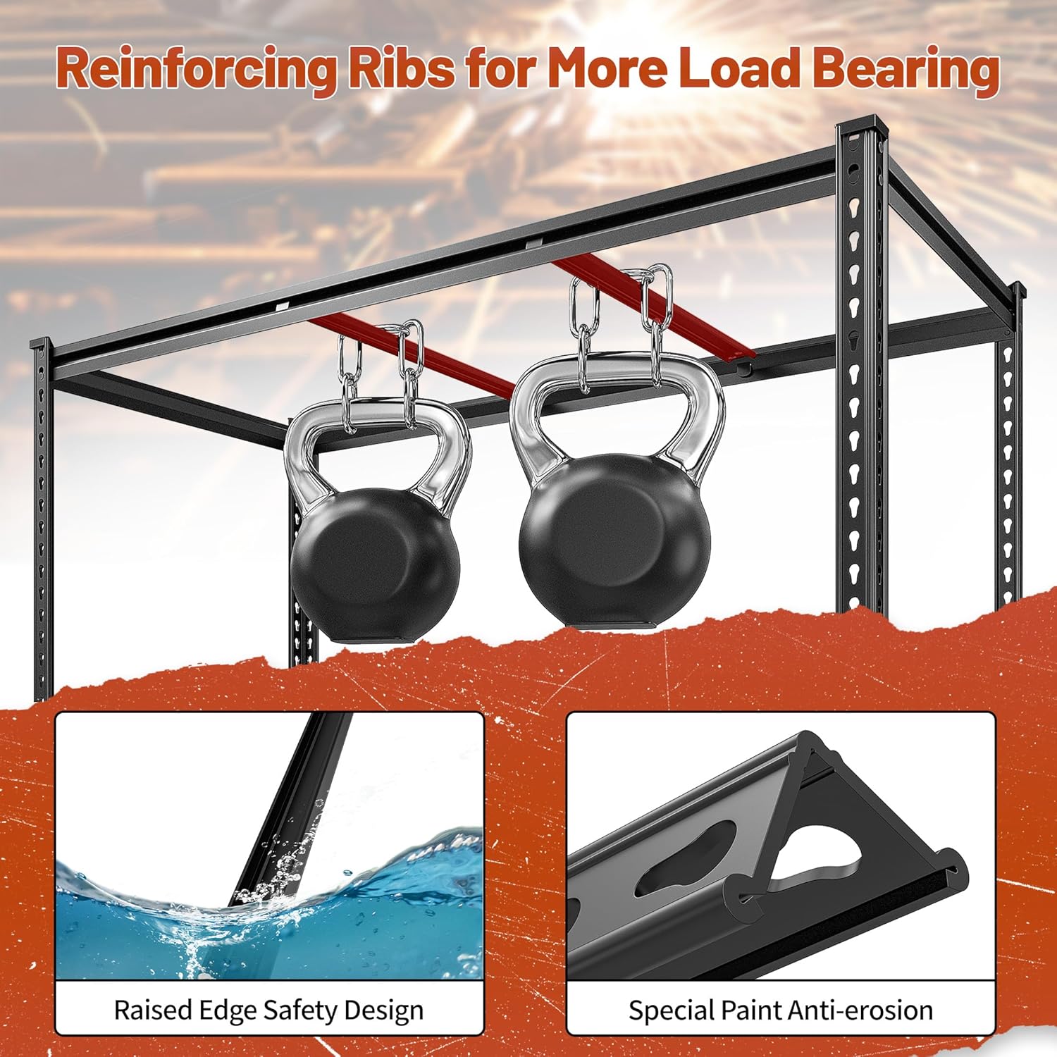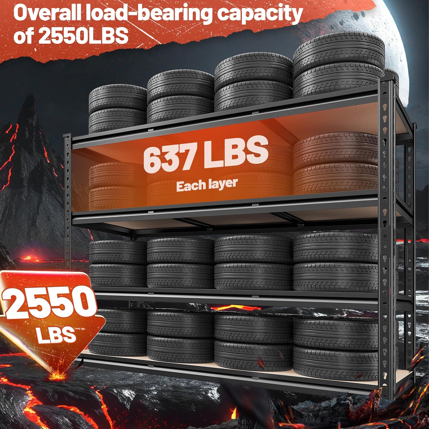 - γ2550LBS Capacity Garage ShelvingγThis garage shelving is made of heavy duty metal. The rolled edge thickened column effectively protects your hands, and the thickened design makes the load-bearing better, ensuring the single-layer load-bearing capacity of the garage shelf 637LBS and the total load-bearing capacity of 2550LBS. It is suitable for garage, workplaces, warehouse, living room, kitchen, to store camping equipment, tools, kitchen supplies