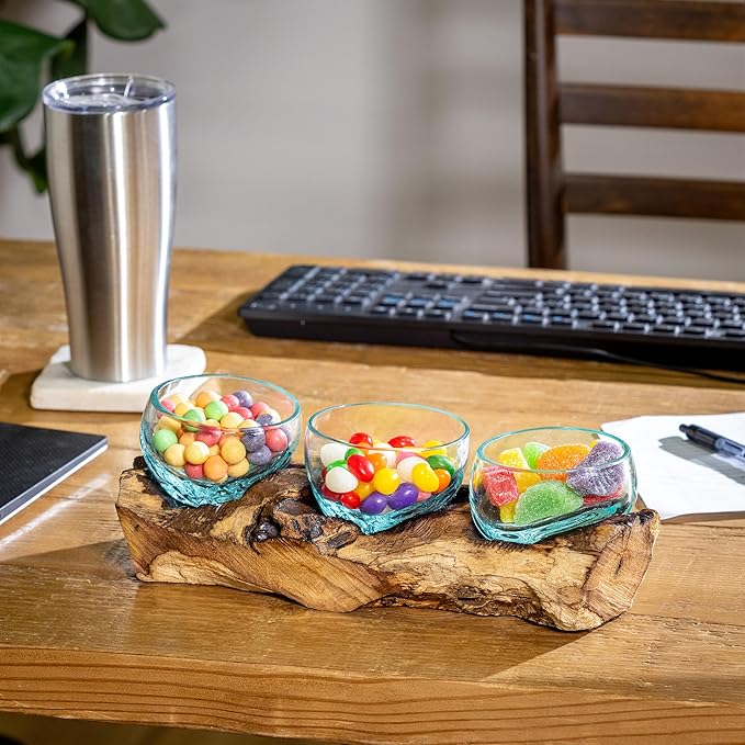 - ONE OF A KIND: Because each beautiful planter display is hand-made, each is unique. To assemble: simply set the glass topper on the driftwood base in the natural grooves of the base. The item is constructed by pressing the glass into the base, so each has a unique formation. Once correctly aligned, it will be a perfect fit! Simply place the glass to the base and you are all set to start displaying! Approximate overall size: 4"H x 13"L x 6"W, with 3 terrariums measuring 3.5" Diameter.