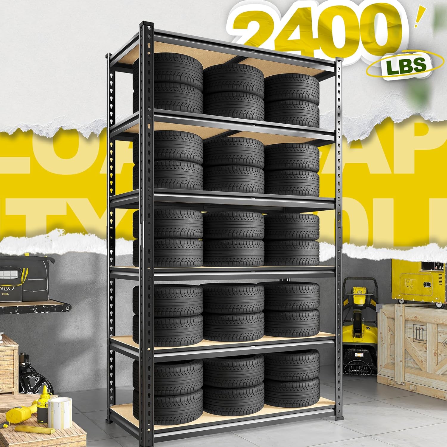 - γ2400LBS Garage Storage Shelves with Rolled Edge DesignγThe storage shelf is constructed from 5mm MDF and thickened metal frame. Rolled edge design of the metal column is not only thicker and better quality of the column, but also protect your hands from scratches. Each shelf with 1 rib beneath, each layer can hold up to 400LBS, with a total bearing capacity of 2400LBS. The robust design allows the garage storage shelves to stably hold various heavy items, making it easy to keep your space neat and organized